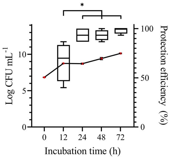 The protection efficiency was analyzed by ANOVA, and the mean values were compared with Tukey’s test at the 5% significance level, except for patulin degradation, which was analyzed by an unpaired t-test with Welch’s correction [36]. InfoStat/L software (Córdoba, Argentina) [37] and GraphPadPrism v. 8.4.3 (San Diego, CA, USA) were used for statistical analysis. Box plots show the first and third quartile, and the whiskers extend to the 1.5-fold interquartile distance.