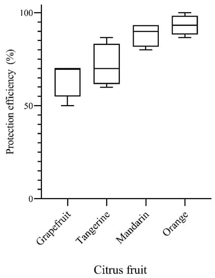 Protection efficiency was calculated as the percentage of healthy lemons after treatment: