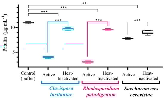 Removal of patulin from solution by C. lusitaniae, Rhodosporidium paludigenum, and Saccharomyces cerevisiae. Cells of the yeasts, native and heat-inactivated, were incubated in phosphate buffer with patulin for 48 h and the patulin concentration in the supernatant was determined. The significance of differences between means was determined by an unpaired t-test with Welch’s correction (n = 5) with *** indicating p < 0.0001 and ** indicating p < 0.001.