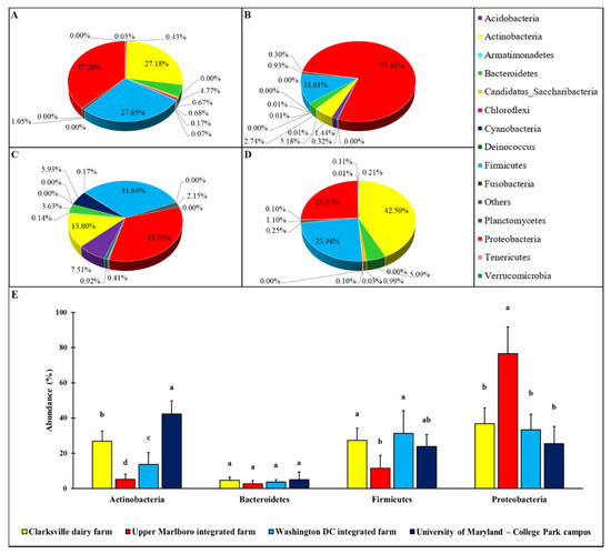 Relative percentage of the phylum level abundance in forearm skin microflora. The relative skin microbial abundance in the investigated individuals from the dairy farm in Clarksville (A), the integrated farm in Upper Marlboro (B) and Washington DC (C), and University of Maryland—College Park campus (D) was analyzed and compared at the phylum level. The top four phyla across each group are shown in (E). The a, b, c, and d indicate significant differences based on ANCOM.
