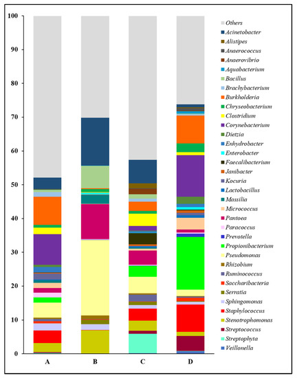Relative abundance of forearm skin microflora at genus level. The relative skin microbial abundance of the top 35 genera in the investigated individuals from the dairy farm in Clarksville (A), the integrated farm in Upper Marlboro (B) and Washington DC (C), and University of Maryland—College Park campus (D) was analyzed and compared.