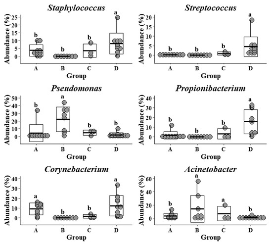 Relative abundance of specific genera in forearm skin microflora. The relative skin microbial abundance of Staphylococcus, Streptococcus, Pseudomonas, Propionibacterium, Corynebacterium, and Acinetobacter in the investigated individuals from the dairy farm in Clarksville (A), the integrated farm in Upper Marlboro (B) and Washington DC (C), and University of Maryland—College Park campus (D) was analyzed and compared. Letters a and b indicate significant differences among groups that are based on ANCOM.
