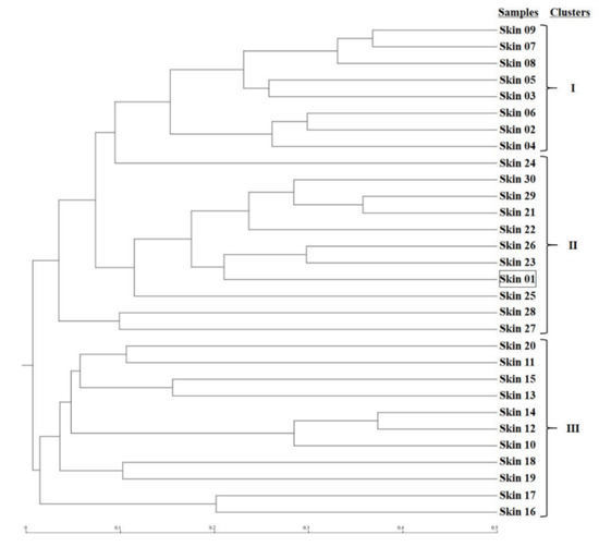 The microbial phylogenetic relativeness in forearm skin swab samples was analyzed and displayed by both dendrogram (Figure 4) and heatmap (Figure S1). Based on the dendrogram from Newick Display, the skin microbiome from various samples was categorized into three major clusters, which were in accordance with the groups and types of the sample sources: Cluster I, as the forearm skin microbiome of farm labors working in Clarksville dairy farm, Cluster II, as the forearm skin microbiome of the reference control from campus employees, and Cluster III, as the forearm skin microbiome of farm labors working in integrated farms (Upper Marlboro and Washington DC). Only one exception was found in skin sample #1, the donor of which is both dairy farm manager and campus employee, and it was classified into Cluster II (Figure 4). Furthermore, the heatmap of phylogenetic distance also illustrated that the forearm skin microbial species diversity was much phylogenetically related (higher similarity index, brighter redness) among samples that were categorized in the same cluster while phylogenetically distant (lower similarity index, darker redness) among samples from different clusters (Figure S1). Additionally, Figure 5 displays the commonness of skin microbial species among different combinations of groups. A total of 7583 microbial species were identified in all skin swab samples, in which they were unorthodoxly distributed and shared across different groups. The forearm skin samples that were collected from the individuals in Upper Marlboro integrated farm, Washington DC integrated farm, and the reference group all shared the most microbial species with those that were collected from the workers in Clarksville dairy farm, as 58.24, 46.58, and 57.68%, respectively, in terms of the ratio of commonness.