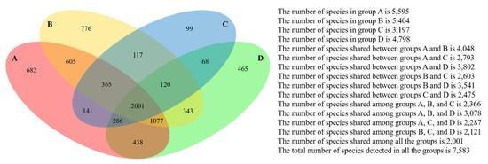 Commonness of forearm skin microbes across different groups. Four-way Venn diagram based on level 0.03 (97% similarity at species level) encloses all 30 datasets categorized in four groups, including Group A—Clarksville dairy farm, Group B—Upper Marlboro integrated farm, Group C—Washington DC integrated farm, and Group D—University of Maryland—College Park campus.