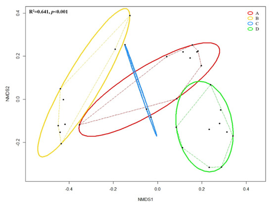 Non-metric multidimensional scaling (NMDS) based on Bray–Cutis distance matrix enclosing all 30 datasets. Black dot represents individual skin microbial community; Solid lines represent ellipses enclosing all points in different groups; Dashed lines represent convex hulls by ordihull function. Significance across groups (p-value) based on ANOSIM; Group A: Clarksville dairy farm; Group B: Upper Marlboro integrated farm; Group C: Washington DC integrated farm; and, Group D: University of Maryland—College Park campus.