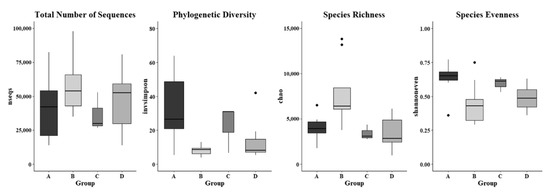 Microbial diversity of forearm skin microbial ecosystem. Alpha diversity indices of nseqs (total number of sequences), invsimpson (phylogenic diversity), chao (species richness), and shannoneven (species evenness) in the investigated individuals from the Dairy farm in Clarksville (A), the integrated farm in Upper Marlboro (B) and Washington DC (C), and University of Maryland—College Park campus (D). Letters a and b indicate significant differences among groups based on ANOVA. The widths of the boxes represent the variances in the observations.