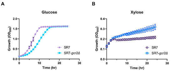 GCR2 is a transcriptional regulator that upregulates glycolytic gene expression, especially at the energy payoff phase of glycolysis [5]. We hypothesized that SR7-gcr2Δ would reduce glycolytic activity, resulting in stimulation of the non-oxidative pentose phosphate pathway, when xylose is used as the alternative carbon source. To test this hypothesis, we characterized the phenotypic change induced by SR7-gcr2Δ by comparing it with the wild-type strain of S. cerevisiae SR7 grown using either glucose or xylose as the sole carbon source. The SR7 strain is an engineered S. cerevisiae D452-2 with heterologous expression of the xylose-assimilating pathway genes from Scheffersomyces stipitis XYL1, XYL2, and XYL3, encoding xylose reductase, xylitol dehydrogenase, and xylulokinase, respectively [10,16]. As expected, when the strains were grown on glucose, the SR7-gcr2Δ strain showed slower growth than the SR7 strain (Figure 1A, specific growth rate 1.78 ± 0.35 h−1 and 0.87 ± 0.03 h−1 for SR7 and SR7-gcr2Δ, respectively). However, when the strains were grown on xylose, the SR7-gcr2Δ mutant grew significantly faster than SR7 strain (Figure 1B, specific growth rate 0.012 ± 0.004 h−1 and 0.052 ± 0.001 h−1 for SR7 and SR7 SR7-gcr2Δ, respectively). These data suggest that gcr2Δ triggers transcriptional alteration of glycolysis and the associated pentose phosphate pathway, which directly improves xylose metabolism in the engineered S. cerevisiae strain.