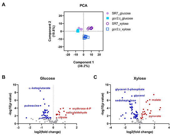 (A) Principal component analysis of S. cerevisiae metabolites. Intensities of metabolites in SR7 and SR7-gcr2Δ grown on glucose and xylose media were detected by GC-TOF MS. (B,C) Volcano plot analysis of identified metabolites on glucose (B) and xylose (C). The scatter plot shows features with fold change (x) and t-test threshold (y) of 0.05, and both values were log-transformed by 2 and 10, respectively. The red or blue dots indicate significantly increased or decreased metabolites in SR7-gcr2Δ compared with SR7 (p < 0.05), respectively.