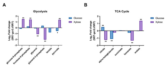 Intracellular metabolite fold-changes in glycolysis (A) and TCA cycle (B) of SR7 and SR7-gcr2Δ grown on glucose (■) or xylose (■). Intracellular metabolites were detected using GC-TOF MS, and fold-changes were converted to a log 2 scale. Statistical analysis was performed using t-test, and differences were considered significant when p was < 0.01 (**) or 0.05 (*).