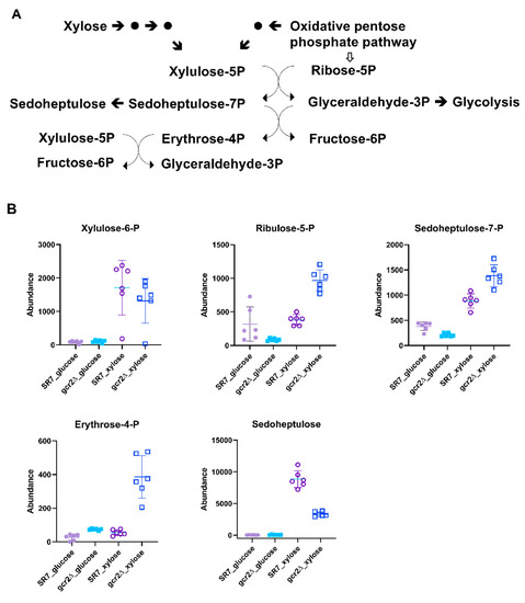 The pentose phosphate pathway is a universal metabolic pathway producing xylulose-5-phosphate as a key metabolic core intermediate, linking xylose assimilation, an oxidative phase, and a non-oxidative phase, in the pathway [18]. We could detect xylulose-5-phosphate, ribulose-5-phosphate, sedoheptulose-7-phosphate, erythrose-4-phosphate, and sedoheptulose as intermediates in the pentose phosphate pathway. All these metabolites showed higher abundance when cells were grown on xylose than on glucose (Figure 5). For xylose assimilation, there was no significant difference in xylulose-5-phosphate levels between the SR7 and SR7-gcr2Δ strains, implicating that the heterologous steps were unaffected in SR7-gcr2Δ.