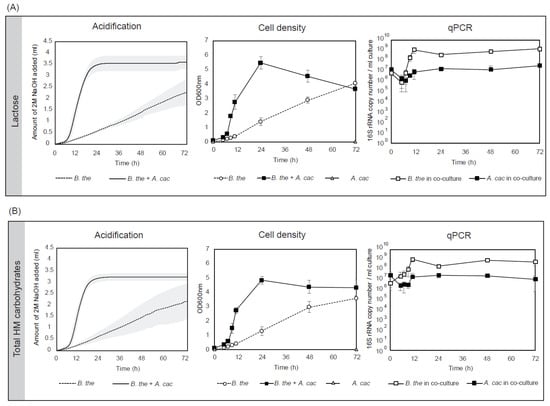 B. thetaiotaomicron supported the growth of A. caccae in the early-life carbohydrates. The cell density (OD600 nm), acidification, and microbial composition (qPCR) of B. thetaiotaomicron monocultures and co-cultures with A. caccae in (A) lactose and (B) total human milk (HM) carbohydrates. Fermentation was performed in an anaerobic bioreactor at pH 6.5. Error bars represent the standard deviation for biological triplicates. No growth was observed for A. caccae in the identical medium cultured in anaerobic tubes (Table S1).