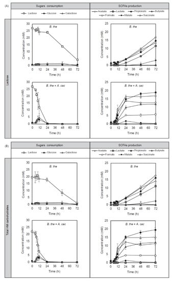 The sugar consumption and short-chain fatty acid (SCFA) production were monitored over time (Figure 2). Similar changes in the composition of metabolites were observed for the fermentation of lactose and total HM carbohydrates which consisted of approximately 10% HMOSs and 90% of lactose [25]. B. thetaiotaomicron monoculture showed limited substrate catabolism as a low amount of lactose (4.24 ± 0.73 mM in lactose and 1.15 ± 0.83 mM in total HM carbohydrates) was still detected after 72 h of fermentation. A low amount (around 1 mM) of monosaccharides, including glucose and galactose, were detected in the supernatant throughout the course of fermentation. B. thetaiotaomicron produced acetate, propionate, succinate, and lactate, as well as a low amount of malate from lactose and total HM carbohydrate fermentation. The co-culture of B. thetaiotaomicron with A. caccae showed a rapid consumption of lactose with complete depletion within 24 h. Up to 3 mM of glucose and galactose were detected in the supernatant of co-cultures after the first 12 h of fermentation. The major metabolites in the co-cultures were propionate, succinate, acetate, butyrate, and formate. Butyrate, the signature product of A. caccae, was produced at 11.85 ± 0.32 mM in lactose and 12.23 ± 1.80 mM in total HM carbohydrates. In contrast to the monoculture, several additional changes were observed in the metabolites of the co-culture, including no detection of lactate, a decrease in acetate and malate after 24 h, and the production of formate (5.70 ± 0.64 mM in lactose and 4.32 ± 0.65 mM in total HM carbohydrates).