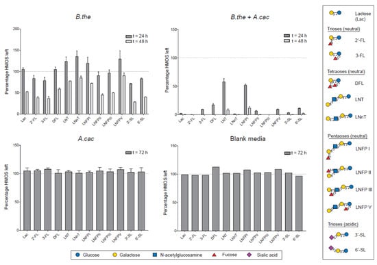 B. thetaiotaomicron monoculture and B. thetaiotaomicron + A. caccae co-culture showed differential utilization of human milk oligosaccharide (HMOS) structures. The percentage of HMOSs left in B. thetaiotaomicron monoculture is significantly higher (p < 0.05) than B. thetaiotaomicron + A. caccae co-culture at 24 and 48 h for all structures. Error bars represent the error propagation for the mean of three (for A. caccae) or four (for B. thetaiotaomicron and B. thetaiotaomicron + A. caccae) biological replicates measured in technical triplicates. The blank control was measured only in technical triplicates. Abbreviations: 2′-FL, 2′-fucosyllactose; 3-FL, 3-fucosyllactose; DFL, difucosyllactose; LNT, lacto-N-tetraose; LNnT, lacto-N-neotetraose; LNFP I, lacto-N-fucopentaose I; LNFP II, lacto-N-fucopentaose II; LNFP III, lacto-N-fucopentaose III; LNFP V, lacto-N-fucopentaose V; SL, sialyllactose.
