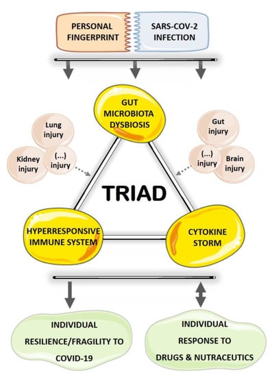 The interplay between the gut microbiota dysbiosis–immune hyperresponse–inflammation triad in Coronavirus Disease 2019 (COVID-19) and the putative influence on disease progression and response to therapies. Rather than being merely restricted to the lower respiratory tract, severe acute respiratory syndrome coronavirus 2 (SARS-COV-2) infection extends to other organs, namely the gastrointestinal tract (multi-tissue infection). Influenced by the lifetime cross-modulations between the immune system and the microbiota (like a personal fingerprint), gut microbiota dysbiosis, immune hyperresponse, and an inflammatory setting are elicited under these circumstances (triad). On behalf of the intricate influence of gut microbiota (GM) on host immune effectors and subsequent inflammatory profile, GM composition and function might contribute to explain the individual resilience/fragility to COVID-19 and/or the response to therapeutics, which deserves further research.