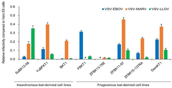 Susceptibilities of bat-derived cell lines to vesicular stomatitis virus (VSV) pseudotyped with filovirus glycoproteins (GPs). Vero E6 and bat-derived cells were infected with VSVs pseudotyped with filovirus GPs (VSV–Ebola virus (EBOV), –Marburg virus (MARV), and –Lloviu virus (LLOV)). The relative infectivity of pseudotyped VSVs in bat-derived cell lines, compared to Vero E6 cells, was determined as described in Section 2. Each experiment was conducted three times, and average and standard deviations are shown. Asterisks represent IUs under the limit of detection (20 IU/mL).