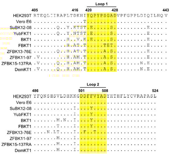 Comparison of amino acid sequences of Niemann–Pick C1 (NPC1) of bat NPC1 orthologues. The deduced amino acid sequences of NPC1-C of SuBK12-08, YubFKT1, BKT1, FBKT1, ZFBK13-76E, ZFBK11-97, ZFBK15-137RA, and DemKT1 are aligned. The amino acid positions of loop 1 and loop 2 are highlighted in yellow.