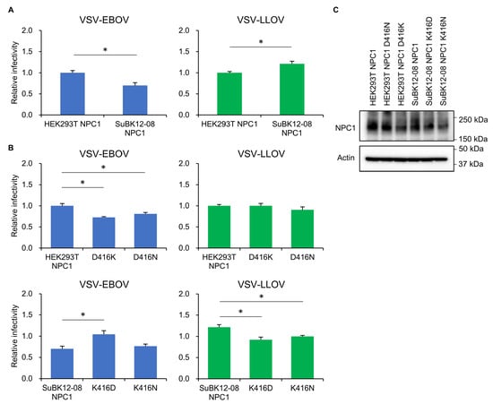 Between 11 and 18 species of bat belonging to the genus Miniopterus of the family Miniopteridae are widely distributed in Europe, Africa, Asia, and Australia []. Phylogenetical analyses of cytochrome b genes of Miniopterus bats have shown that these bats are divided into European/African species and Australian/Asian species [], suggesting that the M. schreibersii bats in Spain may be genetically more similar to the Zambian Miniopterus bat (origin of SuBK12-08) than to M. fuliginosus bats (an Asian bat species and the origin of YuBFKT1). Interestingly, these bat species have different amino acid residues in their NPC1 proteins (K416 and N416 in SuBK12-08 and YuBFKT1, respectively). Site-directed mutagenesis revealed that NPC1 with K416 showed an increased ability to mediate VSV–LLOV infection in SuBK12-08, suggesting that the amino acid residues at this position affected the interaction between GP and NPC1. Thus, Miniopterus bats in Europe and Africa might have a higher susceptibility to VSV–LLOV than those in Australia and Asia. However, another Miniopterus bat species whose NPC1 genome information is currently available (M. natalensis; an African bat species) has N416 of NPC1. Therefore, the relationship between the habitat of Miniopterus bats and amino acid residues at position 416 of NPC1 needs to be analyzed with a larger number of bat NPC1 sequences.