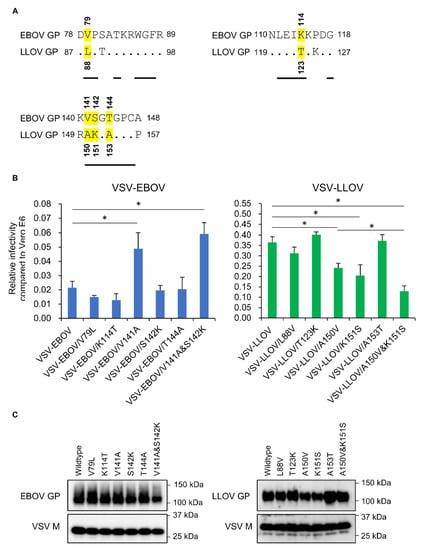 3.3. Comparison of Amino Acid Sequences at the NPC1-Binding Interface of Filovirus GP and the Infectivity of VSV Pseudotyped with EBOV, LLOV, and Their Mutant GPs in SuBK12-08 Cells