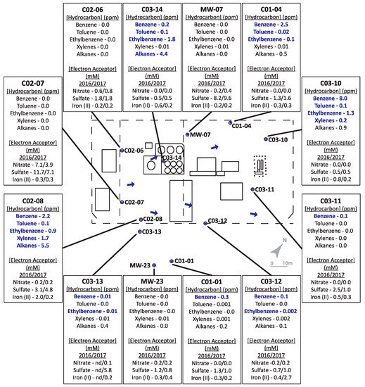 - Müller, J.B.; Ramos, D.T.; Larose, C.; Fernandes, M.; Lazzarin, H.S.C.; Vogel, T.M.; Corseuil, H.X. Combined iron and sulfate reduction biostimulation as a novel approach to enhance BTEX and PAH source-zone biodegradation in biodiesel blend-contaminated groundwater. J. Hazard. Mater. 2017, 326, 229–236. [Google Scholar] [PubMed]