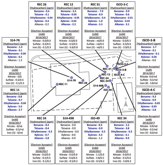 Schematic of Site B, with pop-outs summarizing hydrocarbon concentrations (analyzed in 2016 only) and indicators of potential electron accepting processes (analyzed in 2016 and 2017). Bolded text indicates hydrocarbon concentrations above allowable limits for hydrocarbons in non-drinking groundwater sources. ‘nd’ = no data available as well was not sampled.