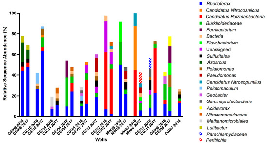 Microbial community profiles found with Site A groundwater wells in 2016 and 2017, with wells arranged in order of decreasing total hydrocarbon concentration, from left to right. Analysis was performed using MetaAmp 2.0 and the SILVA 132 database, with the 2% most abundant taxa shown to the lowest taxonomic level identified.