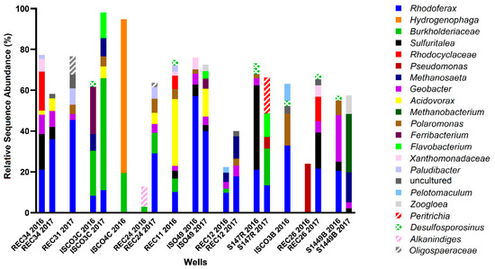 Site B was more highly contaminated site than Site A, with maximum total hydrocarbon concentrations reaching ~35 ppm (REC 34) with 7 wells above 10 ppm (ISCO-3-C, ISCO-4-C, ISO49, REC 11, REC 24, REC 31, and REC 34) (Figure 2, Table S1). Of the 12 wells sampled at Site B, only well S14-49B was non-contaminated, with all measured hydrocarbons below detection levels. The groundwater in all other wells surpassed the 0.005 ppm benzene guideline, the 0.024 ppm toluene guideline, the 0.0016 ppm ethylbenzene guideline, and the 0.02 ppm xylenes guideline (except for well ISCO-3-C at 0.01 ppm xylenes). In 2016, all wells except ISCO-3-B and REC 26 were above the 2.2 ppm alkane guideline. Nitrate and sulfate concentrations for almost all samples collected from in Site B were at or below 0.5 mM, aside from one well (ISO-49 in 2016). Four contaminated wells (REC12, ISCO-3-C, ISCO-3-B, and REC34) had elevated Fe(II) concentrations (4–6 mM), suggesting that iron-reducing microorganisms may be present at the site. The single non-contaminated groundwater well (S14-49B) did not show substantial concentrations of measured electron acceptors. The microbial community profiles of Site B samples collected in 2016 and 2017 are shown in Figure 4. Similar to Site A, Rhodoferax was present in most groundwater samples analyzed, and the microbial community profiles were different in each well sampled (Figure 4). Several taxa detected in the contaminated wells are known to have members capable of hydrocarbon biodegradation, such as Burkholderiaceae, Xanthomonadaceae, Polaromonas, Geobacter, Acidovorax, and Desulfosporosinus. Distinct from Site A, some methanogens were detected in Site B samples, including Methanosaeta and Methanobacterium; these taxa were most abundant in the single non-contaminated groundwater sample at Site B, S14-49B, aligning with the low levels of other potential electron acceptors (Figure 2 and Figure 4). As with Site A, no clear trends in hydrocarbon concentrations, potential electron acceptors, and taxonomic profiles could be discerned for Site B based on these measured parameters.