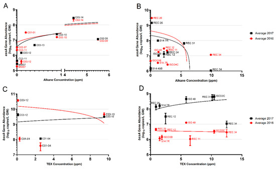 Quantifications of the assA and bssA genes in Sites A and B across 2 years (2016, red circles; 2017, black squares), plotted as a function of alkane or TEX (toluene, ethylbenzene, and xylene) concentrations, respectively. (A) assA gene abundances in Site A wells; (B) assA gene abundances in Site B wells; (C) bssA gene abundances in Site A wells; (D) bssA gene abundances in Site B wells. Linear regression trend lines are matched in colour. Only those samples whose amplicons matched the length of standard amplicons are plotted. Error bars represent the standard deviation of technical replicates (n = 3).