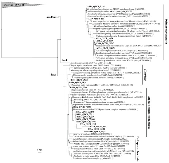 - Acosta-Gonzáles, A.; Rosselló-Móra, R.; Marqués, S. Diversity of benzylsuccinate synthase-like (bssA) genes in hydrocarbon-polluted marine sediments suggests substrate-depending clustering. Appl. Environ. Microbiol. 2013, 79, 3667–3676. [Google Scholar]