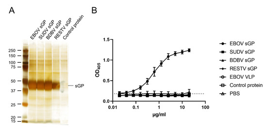 Expression plasmids for pCAGGS-EBOV (Mayinga), SUDV (Boniface), BDBV (Butalya), or RESTV (Pennsylvania 89) sGP were transfected in 293F cells according to the manufacturer’s instructions. After incubation for 4 days, the supernatant was cleared from cell debris by centrifugation twice at 3500 rpm for 10 min at 4 °C. The supernatants containing each sGP were collected and concentrated in Amicon Ultra 30 K filters (Millipore) to a final concentration of 1–2 mg/mL and stored at −80 °C. Supernatant of nontransfected 293F cells was also concentrated using the same method and used as a control protein. Expression of each sGP was confirmed by mixing the concentrated protein 1:1 with sodium dodecyl sulfate-polyacrylamide gel electrophoresis (SDS-PAGE) sample buffer containing 20% β-mercaptoethanol and incubated at 99 °C for 10 min. SDS-PAGE with all samples was performed in parallel on Tris-Glycine eXtended (TGX) criterion pre-cast gels (Bio-Rad Laboratories). The gel was processed for silver staining, using the Pierce Silver Stain Kit (Thermo Fisher Scientific, USA).