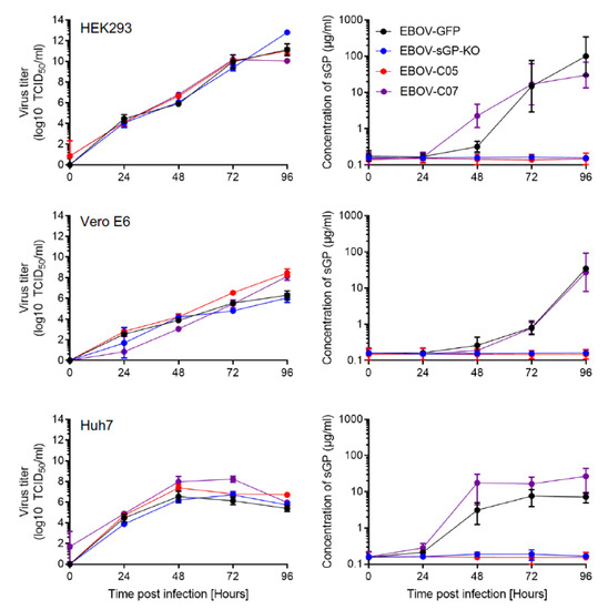 Vero E6, HEK293, or Huh7 cells were grown to confluency in a 12-well plate and infected in triplicate with EBOV-GFP, EBOV-sGP-KO, EBOV-C05, and EBOV-C07 (multiplicity of infection (MOI) 0.01). After 1 h incubation at 37 °C, the cells were washed 3 times with plain DMEM, and DMEM containing 2% FBS was added. Supernatant samples were collected at 0, 24, 48, 72 and 96 h post-infection and stored at −80 °C. The titer of supernatant samples was determined by a 50% tissue culture infectious dose (TCID50) assay on Vero E6 cells.