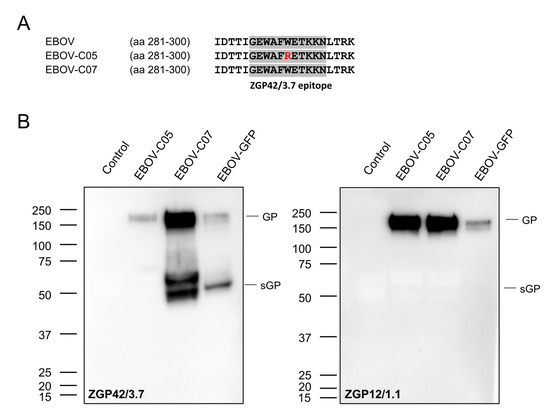 In order to determine the kinetics of EBOV sGP expression in cell culture supernatants after infection, we performed growth kinetics with four different EBOVs: EBOV-GFP, EBOV-sGP-KO, EBOV-C05, and EBOV-C07. Vero E6, HEK293, and Huh7 cells were infected in triplicate with each virus at a MOI of 0.01, and samples were collected from the supernatant at 0, 24, 48, 72, and 96 h. The sandwich ELISA detected the sGP of EBOV-GFP and EBOV-C07 in all infected cell lines, and the dynamics were similar to the dynamics of the infectious virus titer (Figure 2). As expected, we could not detect sGP in the supernatant of EBOV-sGP-KO-infected cells, since this virus was mutated to not produce sGP. Surprisingly, no sGP was detected in the supernatant of cells infected with EBOV-C05 (Figure 2). In order to analyze if EBOV-C05 does not express sGP or if the antibody does not bind, viral RNA was extracted from the supernatant samples and the nucleotide sequences of the GP genes were determined. We confirmed that the sequence of the editing site matches the previously published sequences (EBOV AF086833.2; EBOV-C05 MG572232.1; and EBOV-C07 MG572233.1). We found that EBOV-C05 has a different amino acid (aa), Arg (R), at position 291 within the GP gene (Figure 3A), which is located in the binding epitope of capture antibody ZGP42/3.7 [21]. Western blot analysis confirmed that ZGP42/3.7 can be used for detection of GP and sGP of EBOV-C07 and EBOV-GFP, but this antibody does not bind to EBOV-C05 sGP and only very weakly to its GP (Figure 3B). As a control, the anti-EBOV GP-specific antibody ZGP12/1.1 was used, as it is known to bind only to EBOV GP. Indeed, GP was detected in all samples with the weakest signal in EBOV-GFP confirming that binding to ZGP42/3.7 is the problem, not GP or sGP expression.