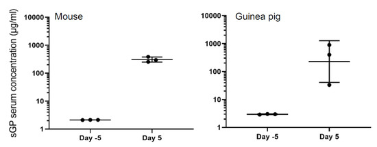 To investigate whether the sandwich ELISA could be used to detect the EBOV sGP in serum of infected animals, we first analyzed mouse and guinea pig serum samples collected 5 days prior to EBOV infection (day −5) and on day 5 after which is at a moderate-to-late stage of disease in these rodent models. We could not detect any EBOV sGP prior to challenge, but high amounts of EBOV sGP were detected on day 5 after virus infection in both rodent models (Figure 4), demonstrating that this ELISA can be used for serum samples.
