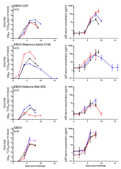 Detection of sGP in nonhuman primates (NHP) serum samples. Groups of NHPs were inoculated with each EBOV variant, and blood and serum samples were collected at every exam day and at the time of euthanasia. RT-qPCR (left panels) and ELISA (right panels) are shown. ELISA was performed in triplicate; geometric mean and standard deviation are shown.