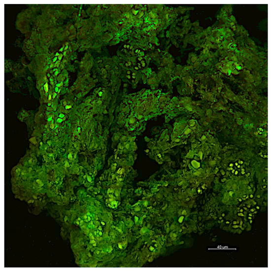Confocal laser scanning imaging of biofilm growing on a Candoglia marble after a chemical cleaning (5% benzalkonium chloride followed by hydrogen peroxide) combined with a mechanical treatment (mechanical brushing and wet brushing) as previously reported by Villa et al. [12]. The green signal corresponding to Syto9 stain, which binds to DNA, appeared to be spread across the mineral surface. This result indicated the presence of intracellular material on the marble, which may suggest that dead cells were not completely removed after the cleaning treatment. The scale bar is 40 µm.