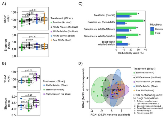 Microbiota present in at least 50% of samples were used to assess rumen fungi (79 ASVs) and bacterial composition (1518 ASVs). Redundancy analyses (Vegan package) [35] were performed to assess the observed variation in the composition of rumen fungi explained by diet (overall). For each treatment, diet was compared to the baseline and bloat-status within the alfalfa–sainfoin diet. Identical analyses were performed to assess the variation in rumen bacterial composition explained by diet and bloat-status. ASV counts were center-log transformed using the CoDaSeq package [36] after imputation of zeros using a Bayesian multiplicative replacement method implemented in the zCompositions package [37].
