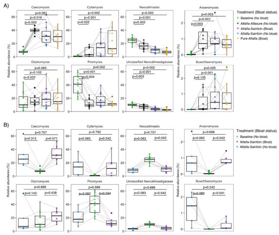 Pair-wise comparisons of the proportion of anaerobic rumen fungal genera (A) between baseline and each of the treatments, and (B) among steers that did and did not bloat while grazing alfalfa-sainfoin and the baseline alfalfa hay diet. Boxes show the interquartile range with a line at the median and whiskers showing minimum and maximum values. A line between two individual dots indicates the same steer in different groups. Comparisons were tested using Wilcoxon signed-rank test on center log-ratio proportions. FDR corrected p-values were obtained using the Benjamini–Hochberg procedure. p-values for all possible pair-wise comparisons can be found in Supplementary File S1.