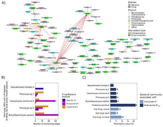 Co-occurrence patterns between fungal and bacterial ASVs were assessed across all steers (Figure 3A), as well as between steers that did and did not bloat (Figure S2A,B, respectively). Overall, a large percentage of observed interrelationships among fungal and bacterial ASVs were mutually exclusive (i.e., negative relationship between the proportion of two ASVs; including 81% of relationships in the overall network, 88% in bloat network, and 77% in non-bloated network), suggestive of the presence of competitive interactions among fungi and bacteria within the rumen. Within each network, the top 4 ASVs having the highest number of connections (i.e., significant relationships) with other ASVs in the network were all fungi. Figure S2B depicts fungal hub ASVs with a considerable number of connections to various rumen bacteria (showing > 10 significant +/− relationships in one network). These fungal hub ASVs were next assessed in downstream analyses for their potential influence on the composition of the rumen bacterial population (Figure 3A). Interestingly, redundancy analysis revealed that Buwchfawromyces eastonii, a major hub-ASV identified in the network analysis of steers without bloat, had the highest explanatory power regarding variations in ruminal bacterial composition (Figure 3B). Similarly, Piromyces sp. 5, Caecomyces communis 5, and Piromyces sp. 7, identified as hub-ASVs by network analysis of non-bloated steers, could also explain more than 5% of the overall variation in ruminal bacterial composition. The only major fungi hub-ASV in the network of steers with bloat (Neocallimastix frontalis. 5), generally did not explain as much variation in rumen bacterial composition (Figure 3B). Assessments of the combined influence of hub-fungi on ruminal bacterial composition revealed that changes in the proportion of hub-fungi were associated with bacterial composition in rumen contents from both non-bloated (R2adj = 9.7%, p < 0.01) and bloated steers (R2adj = 4.9%, p < 0.01; Figure 3C).
