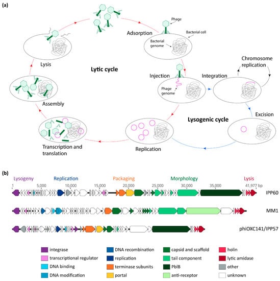 Bacteriophage life cycles and genetic modules. (a) General model of phage lytic and lysogenic cycles; (b) comparison of the sequences of three pneumococcal temperate phages: IPP60 (KY065496.1), MM1 (NC_003050.2), and phiOXC141/IPP57 (KY065494.1). Annotated open-reading frames are represented by arrows that point in the direction of transcription, and are color-coded according to their putative function.