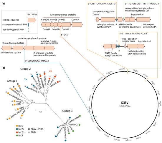Pneumococcal temperate phage groups and their chromosomal integration loci. (a) Chromosomal integration sites of pneumococcal phages. Thin arrows indicate the precise locus of the phage attachment sites, in relation to their immediate genetic context and their location on the circular representation of the D39V (CP027540.1) genome. Direction of the arrows reflects the orientation of phage integration in the chromosome respective to the integrase being located at the 5′ end of the integrated phage, as is the convention. Color of the arrows and connecting lines refer to the integrase type in panel (b). The nucleotide sequence of each core attachment site is indicated at each integration locus, as previously defined by Romero et al. [] (Int1) and Gindreau et al. [] (Int2a, including modifications reflecting single nucleotide polymorphisms in the genomes used in panel (b)), or as determined by the authors by aligning the left and right phage–chromosome junctions with the corresponding chromosomal site in the genome of D39V, in the case of Int3 and Int2b; (b) phylogenetic tree of a selection of pneumococcal temperate phages for which the genetic context could be determined. The multiple alignment of phage genomes was performed using MUSCLE v.3.8 []. The phylogenetic tree was constructed using FastTree v.2.1.10 [] and visualized in MEGA-X v10.1.8 []. Colored dots represent the integrase type according to the key, and refer to the similarly-colored arrows pointing to the integration sites in panel (a). All Int1-encoding phages depicted here, except for IPP67, integrate in csRNA3. The presence of genes encoding the putative virulence factors PblA and PblB is indicated. Accession numbers of the sequences used are listed in Appendix A, Table A1.