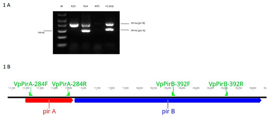 The pirA and pirB genes were detected by duplex PCR using PuReTaq ready-to-go PCR beads. The primers used were VpPirA-284F TGA CTA TTC TCA CGA TTG GAC TG/R VpPirA-284R CAC GAC TAG CGC CAT TGT TA that amplifies a 284 bp amplicon of the pirA gene and VpPirB-392F VpPirB-392F TGA TGA AGT GAT GGG TGC TC/R VpPirB-392R TGT AAG CGC CGT TTA ACT CA that amplifies a 392 bp region of the pirB gene. Amplifications were performed with the following parameters: an initial denaturation at 94 °C for 3 min, followed by 35 cycles of 94 °C for 30 s, 60 °C for 30 s and 72 °C for 30 s, and a final extension at 72 °C for 7 min [18]. Following PCR, an aliquot of the PCR products was analyzed in a 1.5% gel containing 1 × gel red (Biotium, Fremont, CA, USA), and the gel was photographed using a BIORAD Gel Doc XR+ imaging system (BioRad, Hercules, CA, USA).