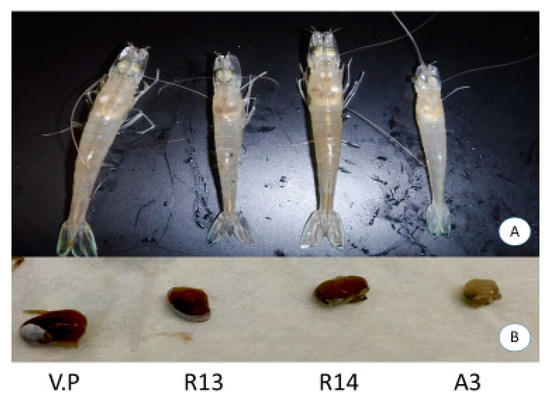 Clinical signs of shrimp, Penaeus vannamei, experimentally infected with four different isolates of Vibrio parahaemolyticus—V. parahaemolyticus ATCC strain (V.P), R13, R14 and A3 (AHPND reference strain). Panel (A): Shrimp on the left shows a normal color in the hepatopancreas and the shrimp on the right shows a pale discoloration on the hepatopancreas and an empty stomach—typical signs of AHPND-infected shrimp. The control shrimp (unchallenged) and the shrimp challenged with R13 and R14 all showed a normal color (dark brown) of hepatopancreas while all the shrimp challenged with the reference strain A3 showed a pale discoloration of the hepatopancreas. Panel (B) shows a sample of a typical hepatopancreas dissected from shrimp exposed to R13, R14 and A3. The shrimp infected with the A3 strain shows an atrophied and pale hepatopancreas.