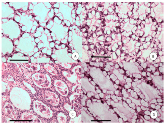 Histological sections of the hepatopancreas (HP) of Penaeus vannamei shrimp challenged with four strains of Vibrio parahaemolyticus. (A) V.P-ATCC; (B) R13; (C) VPAHPND strain A3; (D) R14 isolate. Only C displays acute HP necrosis with severe sloughing of HP tubule epithelial cells. Mayer–Bennett H&E. Scale bars = 100 μm.