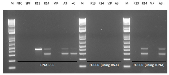 The binary toxin genes pirA and pirB were detected in shrimp challenged with R14 strains, while only the pirB gene was detected in the shrimp challenged with R13 (Figure 1). To further confirm that the toxin genes are not expressed, total RNA was extracted and cDNA was used to perform RT-PCR to amplify the pirA and pirB genes. A photomicrograph of an agarose gel showing cDNA amplicons representing the binary toxin genes amplified by duplex RT-PCR is presented in Figure 5. The pirA and pirB genes could not be amplified by RT-PCR in R13; meanwhile, R14 and A3 strains displayed expression of the toxin genes (Figure 5).