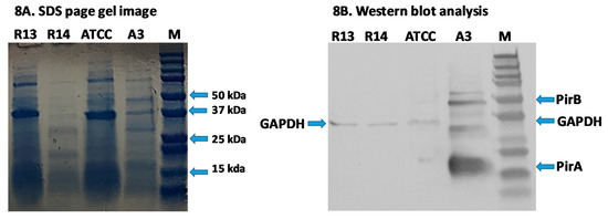 Using PirA and PirB polyclonal antibodies, both PirA and PirB toxins were detected in the reference strain A3 and were not detected in the R13, ATCC and R14 strains. (Figure 8a,b). The results confirmed that the binary toxin is only expressed in the V. parahaemolyticus reference strain A3. The toxins are not expressed in R13 and R14 strains, despite the fact that both pirA and pirB transcripts were detected in R14 by RT-PCR.