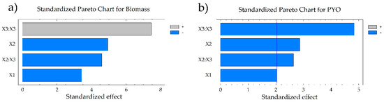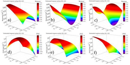 | Response | Biomass Calculated, 0.71 g L−1 PYO Calculated, 2.21 µg mL−1 (Desirability = 0.9084) | |