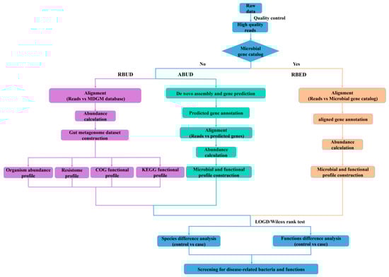In this study, we employed two conventional methods (assembly-based metagenomics profiling for unestablished database (ABUD) and read-based metagenomics profiling for established database (RBED)) and our newly developed method (RBUD) to analyze the intestinal microbial metagenomes of avian colibacillosis chicken and T2D patients, comparing the accuracy and effectiveness of the three methods [8]. The flow chart showed the difference of the three analyses (Figure 1). These three methods can be distinguished by whether there is an established reference gene catalog and whether the contigs are assembled.