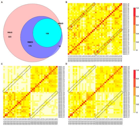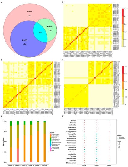 Changes of the microbial community detected by the three methods between healthy group and avian colibacillosis group. (A) Venn Diagram showed the specific and the common bacterial species identified by RBUD, ABUD and RBED. (B) Species similarity between RBUD and ABUD using Bray–Curtis similarity matrix correlation analysis. The box represents the similarity of bacteria species in the same sample using different methods. (C) Species similarity between RBUD and RBED using Bray–Curtis similarity matrix correlation analysis. (D) Species similarity between ABUD and RBED using Bray–Curtis similarity matrix correlation analysis.