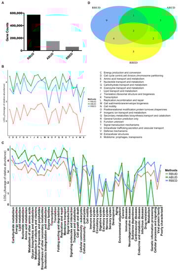By comparing the microbial species obtained by the three methods, it was found that the microbes identified by the RBUD method could include most of the microbes acquired by the other two methods (Figure 4A). Unsurprisingly, the microbial composition obtained by the RBUD and ABUD methods was correlated in each sample, which was shown in the boxes of a Bray–Curtis correlation analysis chart (Figure 4B). However, the correlation of microbial composition between RBED and the other two methods was very weak (Figure 4C,D). The Jaccard similarity coefficient analysis which does not consider the abundance of species showed no significant pairwise correlation of the three methods. This illustrated that the abundance of microbial species was of great significance in analyzing the similarity of microflora (Figure S1D–F).