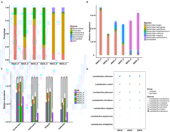 Characteristics of gut microbiota at different taxonomic levels using these three methods in avian colibacillosis. (A) The changes of the abundance percentage of gut microbiota between healthy and diseased cases at the phylum level. (B) The abundance change of species that belongs to the genus of Bacteroides. (C) The significant abundance change of the dominant genus that belongs to Proteobacteria. * adjusted p < 0.05; *** adjusted p < 0.01. (D) The trend changes of species abundance between healthy and disease groups detected by the three methods.