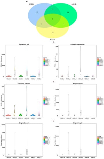 By analyzing the different strains between the disease and the healthy groups obtained by each method, we found that RBUD and ABUD obtained more overlapped strains. Combining the results of three methods, there were six strains of bacteria overlapped, which were all related to avian colibacillosis, including Escherichia coli, Klebsiella pneumonia, Salmonella enterica, Shigella boydii, Shigella flexneri and Shigella sonnei (Figure 6A–G).